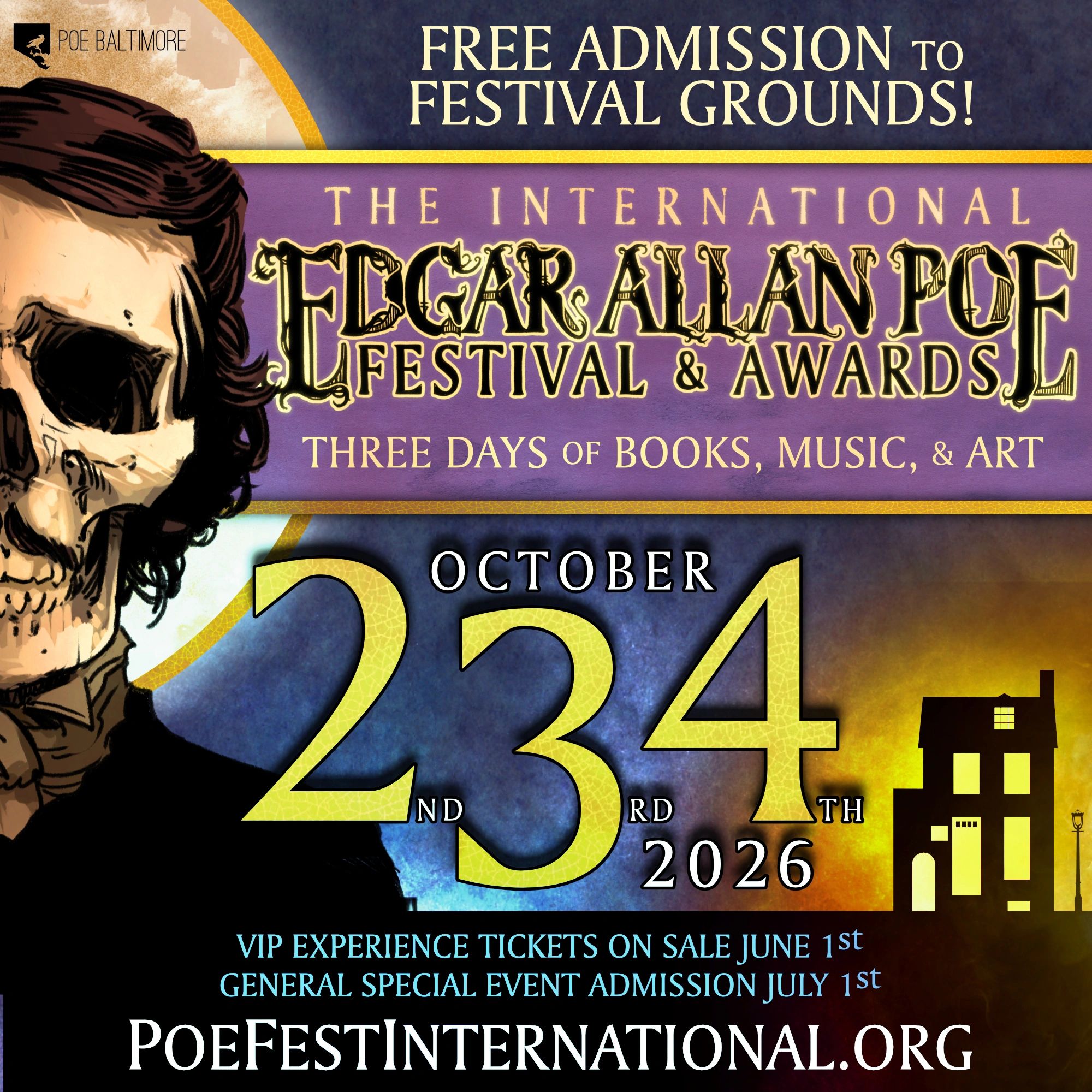 Poe Fest International is a free, family-friendly event featuring Poe-themed performances, art, vendors, booksellers, and food, celebrating Poe’s life, works, and his influence in the arts.